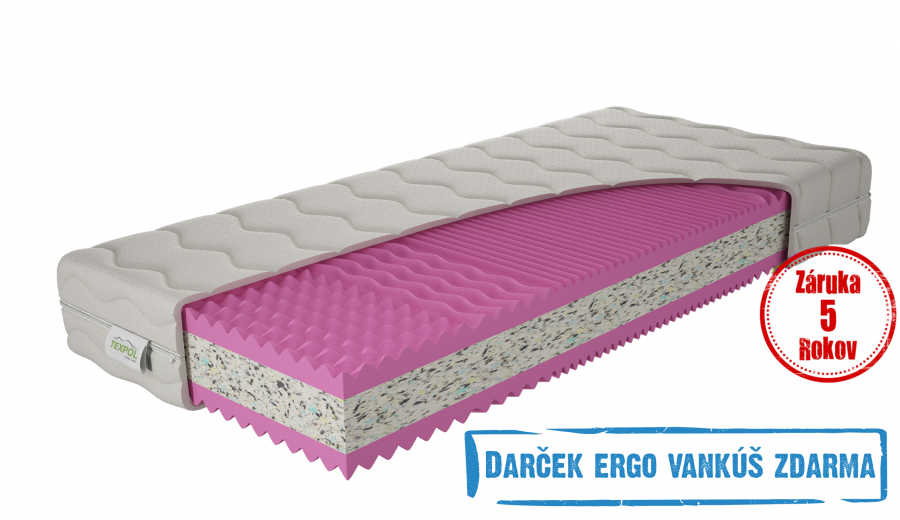 Najpredávanejší sendvičový tuhý zdravotný matrac za obdobie posledných 3 rokov, vylepšený o dve strany tvrdosti 4/5. Ide o tvrdý obojstranný Sendvičový matrac s obojstrannou 7 zónovou profiláciou kvalitnej PUR peny, v kombinácii s tvrdenou doskou POE / RE peny pre lepšie vystuženie matraca.Matrac určený pre ľuďi,ktorí majú radšej spanie na tvrdších matracoch • cenovo prijateľný a obojstranne použiteľný matrac • masážny povrch matraca tvarovaný obojstranne do nopov, ktoré zlepšujú prekrvenie pokožky a uvoľňujú svalstvo počas spánku • odporúčaný rošt lamelový,pevný • štandardné vyhotovenie v poťahu - Silver Line • PUR 7 zón profil 38kg/m3, POE/RE pena 78 kg/m3 Poťah - Poťah - Silver Line• kvalitný a príjemne mäkký poťah so schopnosťou regenerácie pokožky ľudského tela • STRIEBRO je ideálne pri alergii na prach a pri problémoch s nadmerným potením, má antistatické, antibakteriálne, antimykotické vlastnosti, ktoré zabraňujú rastu plesní, vlastnosti tejto látky tak zaručujú vynikajúcu hygienu • certifikovaný a zdravotne nezávadný OEKO-TEX štandard • odzipsovateľný a prateľný do 60 °C • zloženie: 7% sim, 30% viskóza, 70% polyester, poťah zónovo prešitý s klimatizačnou výplňou, PES vláknom 250 gr/m2. Pozor farby pien u matraca (zelená,biela,pomarančová) sa možu meniť podľa dostupnosti materialu od dodavateľa,farba však nemeni vobec nič na vlastnostiach pien u matraca,čo nieje dovod na reklamáciu.Najpredávanejší sendvičový zdravotný matrac je rýchlo dostupný v rozmeroch 200x90 a 200x80 a pri objednávke do 14tej hodiny v pracovný deň,Vám ho zabalime a odošleme kurierom k Vám na adresu,následne ho máte na druhý pracovný deň doma. Ostatné rozmery, vrátane atypov vám doručime do 10 prac. dní. Rýchlo,jednoducho a bez čakania máte svoj vysnívaný kvalitný ortopedický matrac doma.