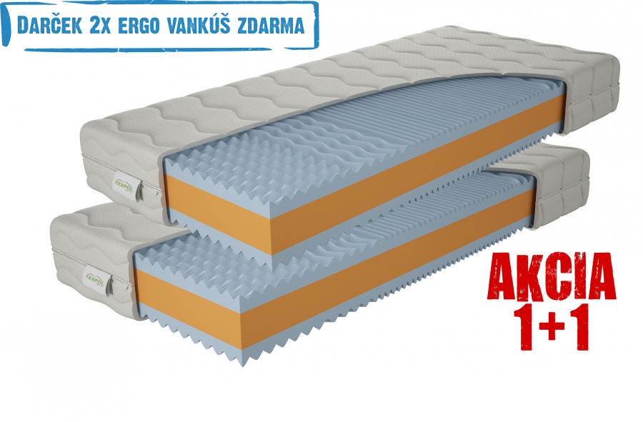 Cenovo bezkonkurenčná ponuka v akcii s nosnosťou do 120 kg a na výšku 19cm. Najpredávanejší komfortný partnerský zdravotný matrac s obojstrannou 7 zónovou rôzne tuhou profiláciou kvalitnej PUR peny v kombinácii s kvalitným jadrom PUR peny pre lepšie vystuženie matraca. • Obojstranne použiteľný matrac s tvrdosťou 3 (stredný) z jednej strany stupnica tvrdosti (1-5) a z druhej strany 4 (stredne tvrdý) stupnica tvrdosti (1-5) cenovo výhodný zdravotný matrac • povrch matraca obojstranne tvarovaný a profilovaný do nopov, ktoré zlepšujú prekrvenie pokožky a uvoľňujú svalstvo počas spánku • odporúčaný rošt lamelový,pevný • štandardné vyhotovenie v poťahu - Silver Line • PUR 7 zón profil 35 kg/m3, PUR jadro 35 kg/m3, PUR 7 zón profil 35 kg/m3 Poťah - Silver Line• kvalitný a príjemne mäkký poťah so schopnosťou regenerácie pokožky ľudského tela • STRIEBRO je ideálne pri alergii na prach a pri problémoch s nadmerným potením, má antistatické, antibakteriálne, antimykotické vlastnosti, ktoré zabraňujú rastu plesní, vlastnosti tejto látky tak zaručujú vynikajúcu hygienu • certifikovaný a zdravotne nezávadný OEKO-TEX štandard • odzipsovateľný a prateľný do 60 °C • zloženie: 7% sim, 30% viskóza, 70% polyester, poťah zónovo prešitý s klimatizačnou výplňou, PES vláknom 250 gr/m2. Pozor farby pien u matraca (zelená,biela,pomarančová) sa možu meniť podľa dostupnosti materialu od dodavateľa,farba však nemeni vobec nič na vlastnostiach pien u matraca,čo nieje dovod na reklamáciu.Jeden z najpredávanejšich zdravotných partnerských matracov je rýchlo dostupný v rozmeroch 200x90 a 200x80 a pri objednávke do 14tej hodiny v pracovný deň,Vám ho zabalime a odošleme kurierom k Vám na adresu,následne ho máte na druhý pracovný deň doma. Ostatné rozmery, vrátane atypov vám doručime do 10 prac. dní. Rýchlo,jednoducho a bez čakania máte svoj vysnívaný kvalitný ortopedický matrac doma.K týmto matracom získavate Ergo vankúš z pamäťovej peny ako darček od nás.